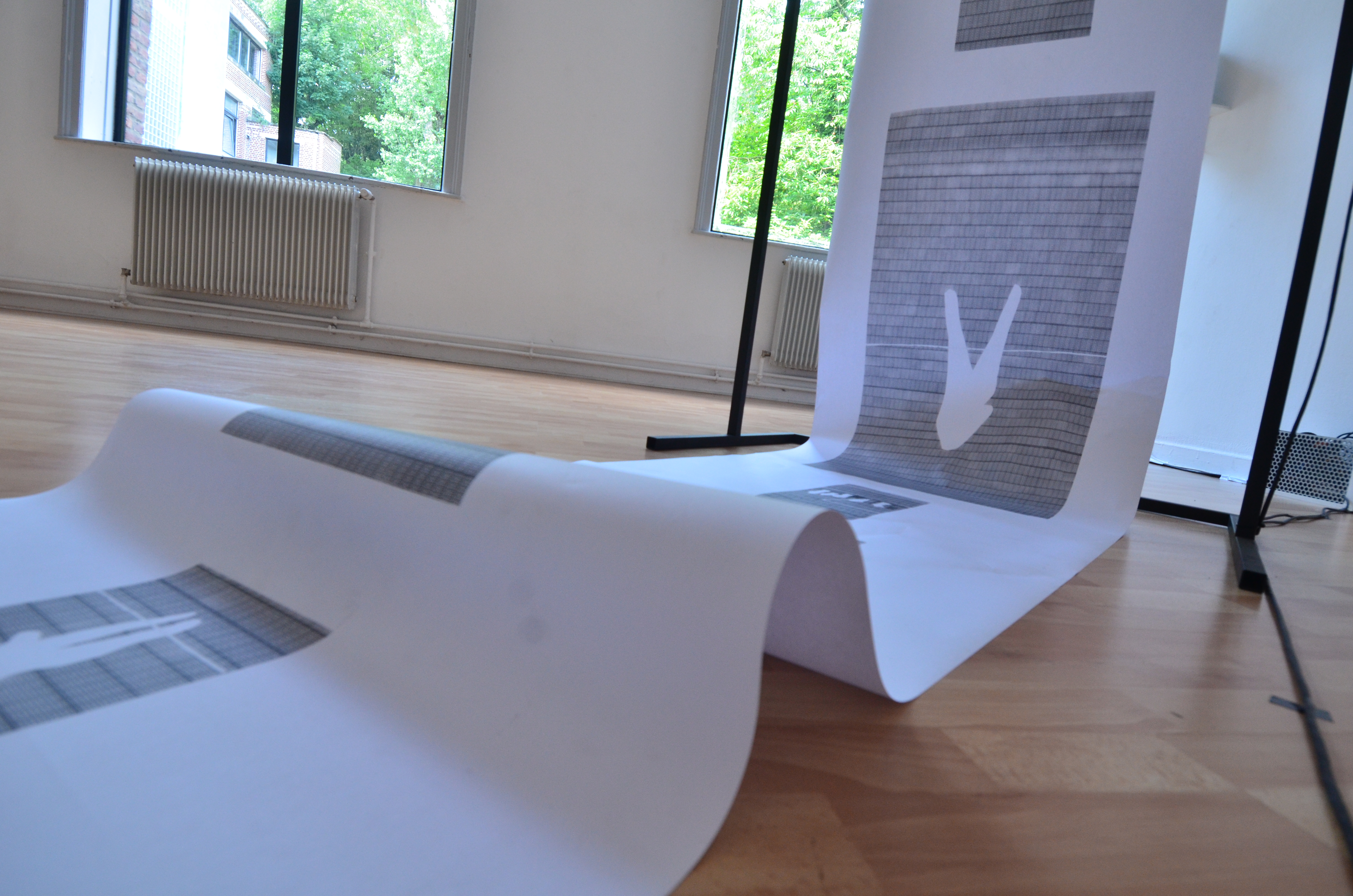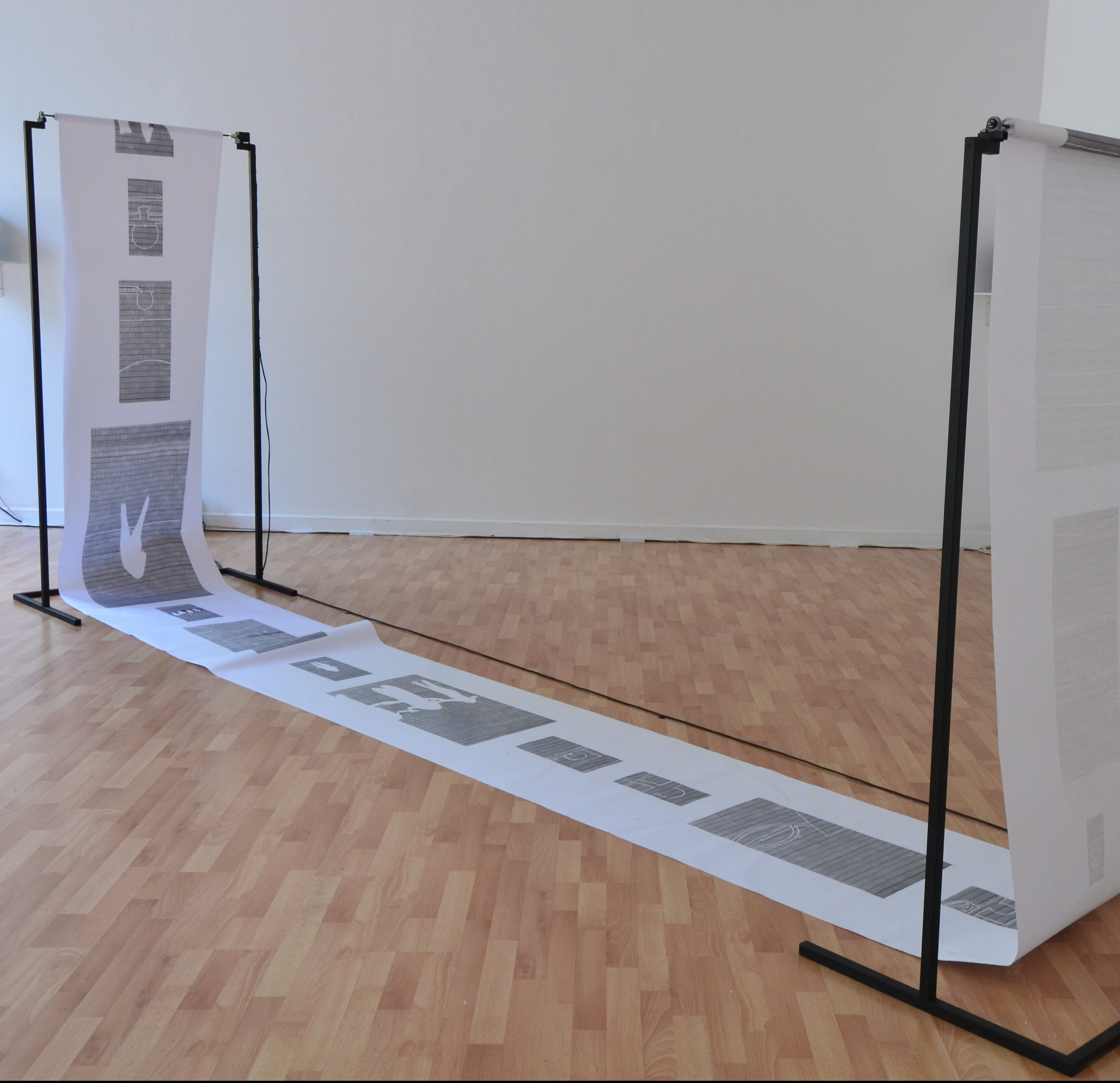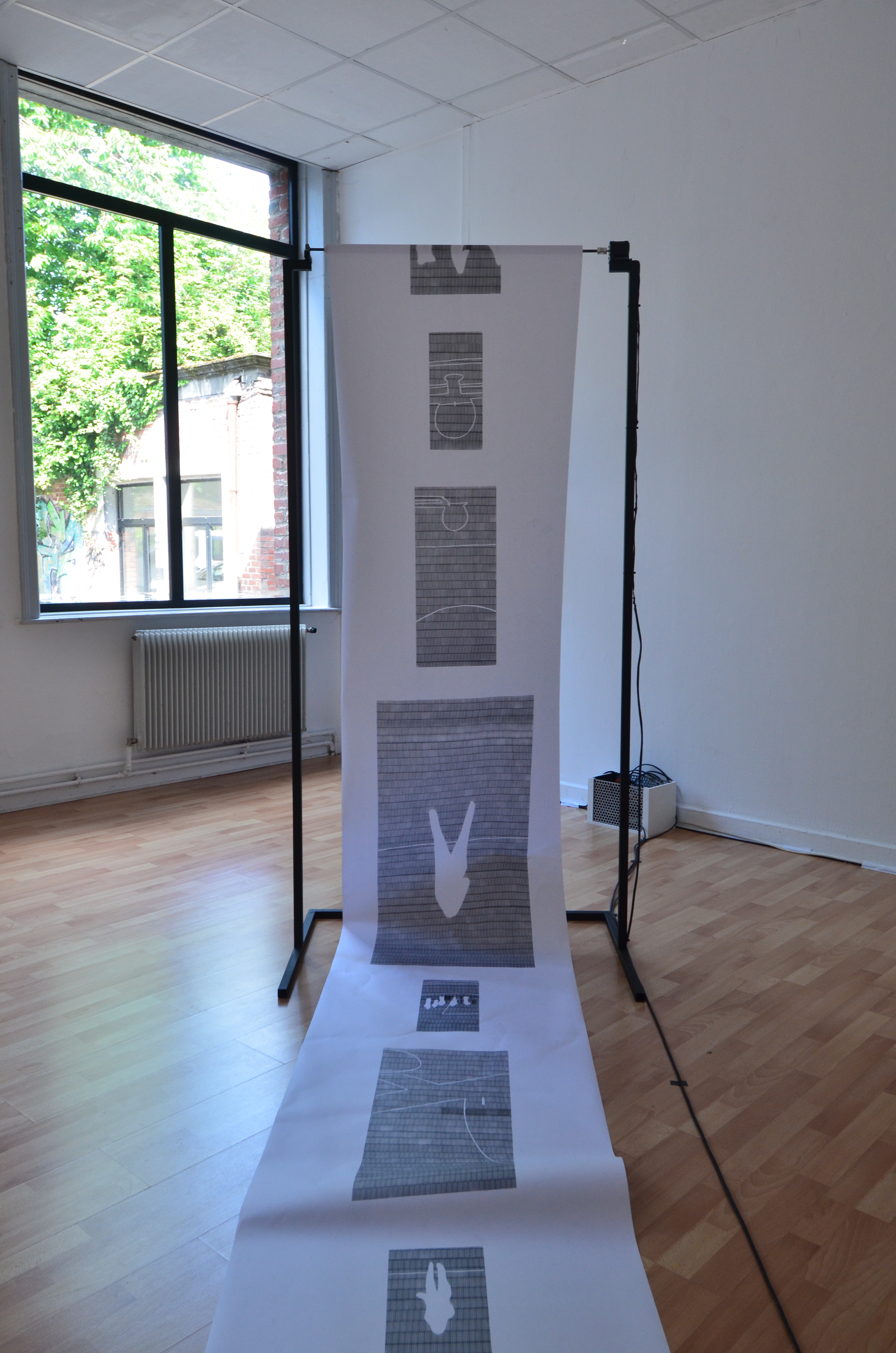 Cette structure motorisée déroule un rouleau de papier sur lequel figurent des estampes qui apparaissent successivement, comme sur notre feed (fil d’actualité) Facebook ou Instagram. De l’autre côté, le papier est enroulé, représentant ainsi l’archivage et la rapidité du changement de l’intérêt sur les réseaux sociaux.